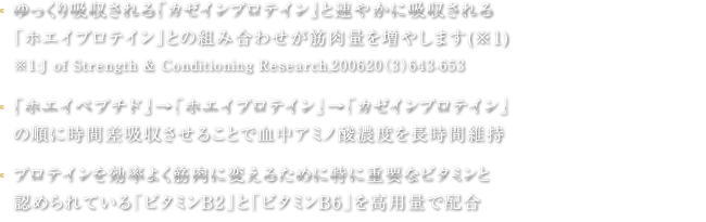 • ゆっくり吸収される「カゼインプロテイン」と速やかに吸収される「ホエイプロテイン」との組み合わせが筋肉量を増やします(※1)
